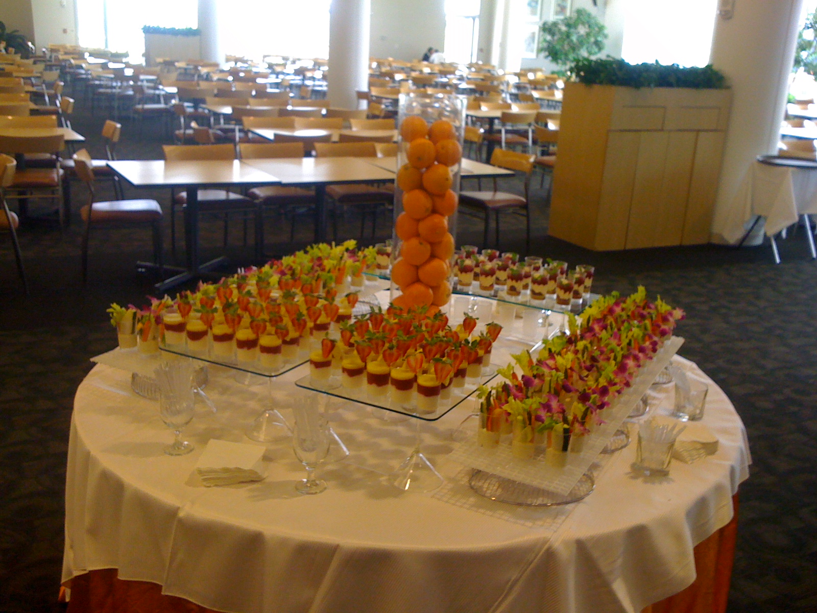 Spring Vegetable Crudite Shooter: Comprised of Baby Carrot, Celery, Seedless Cucumber, Red Pepper, and Ranch Dressing. Garnished with and edible Purple Orchid.