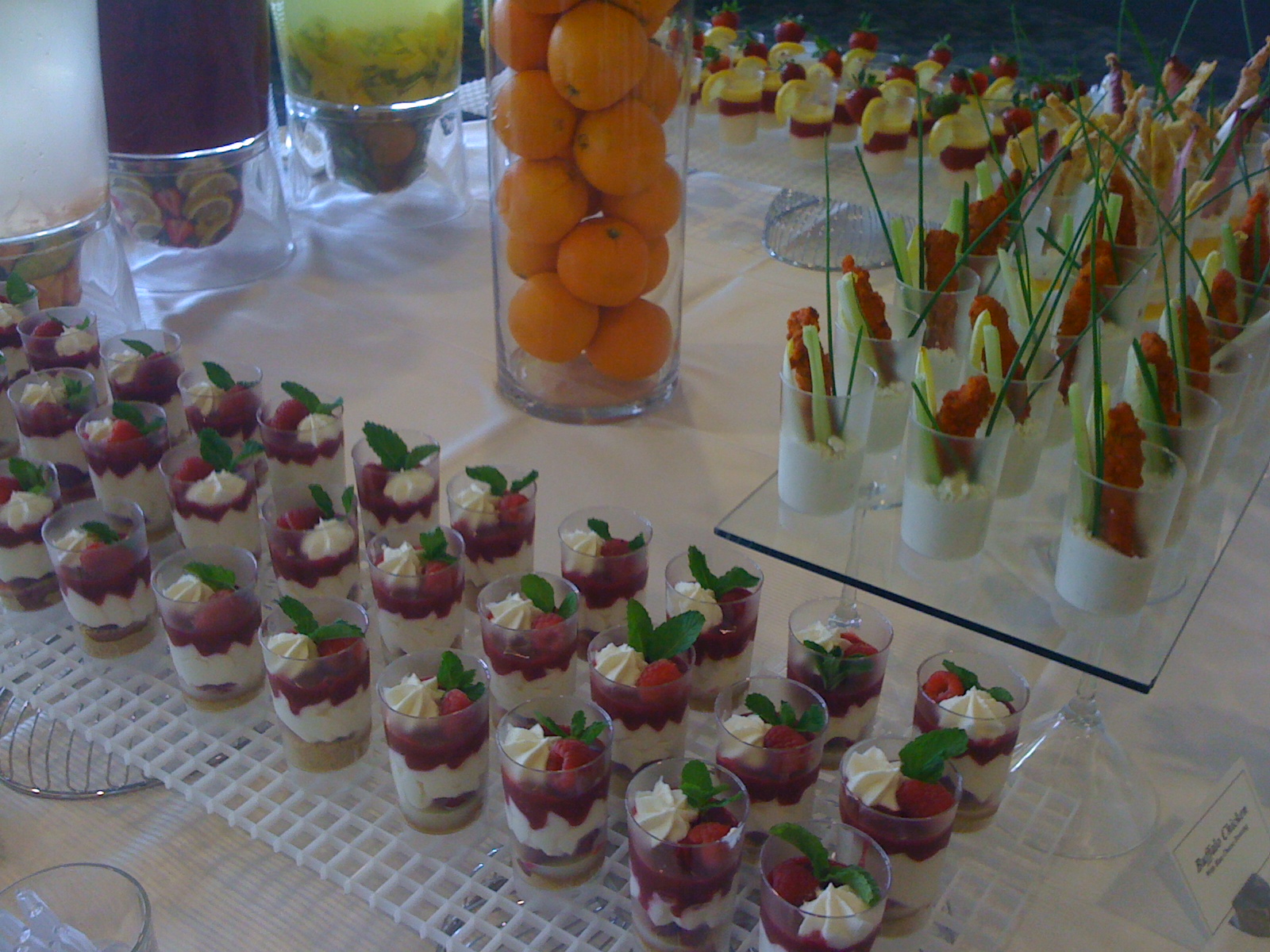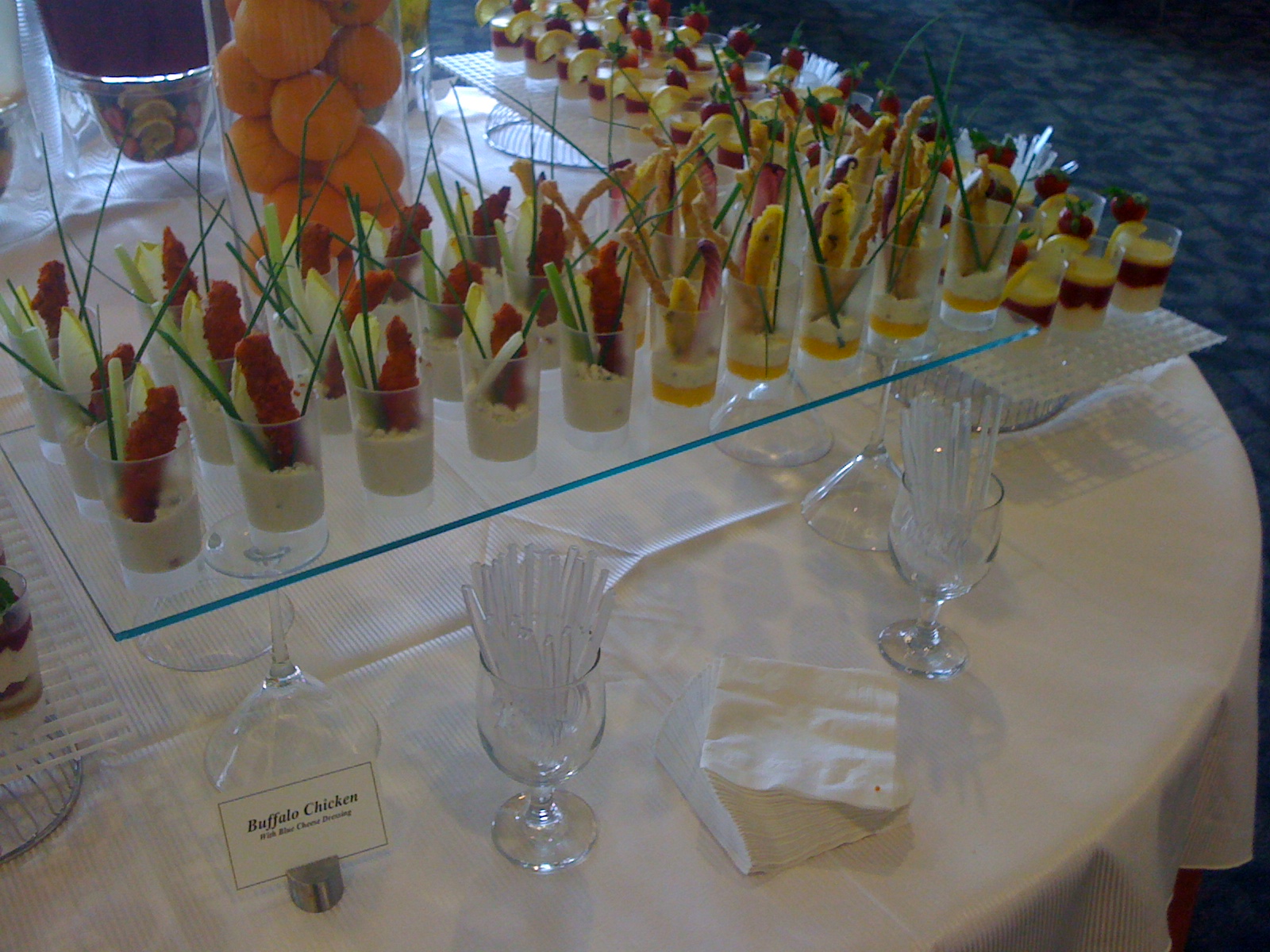 Savory Shooters: Shooter glasses are about 3 inches tall. Here are two savory delights sharing the stage. First up and to the left, we have a Buffalo Chicken Strip Shooter with Blue Cheese Dressing, Celery Stick and Chives. To the right, Herb Chicken Picatta Strips with Lemon-Caper Remoulade and Creamy Saffron Rissoto.