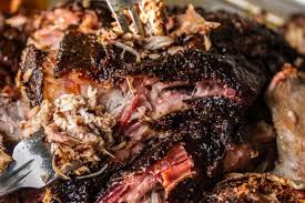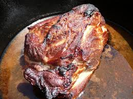 5.) Add half of sauce mixture and chicken stock or water. Cover Dutch oven, transfer to oven, and cook until pork is just starting to turn tender, about 4 hours. Remove lid and continue cooking until a knife or fork shows very little resistance when twisted inside the meat and a dark bark has formed, about 1 hour longer.