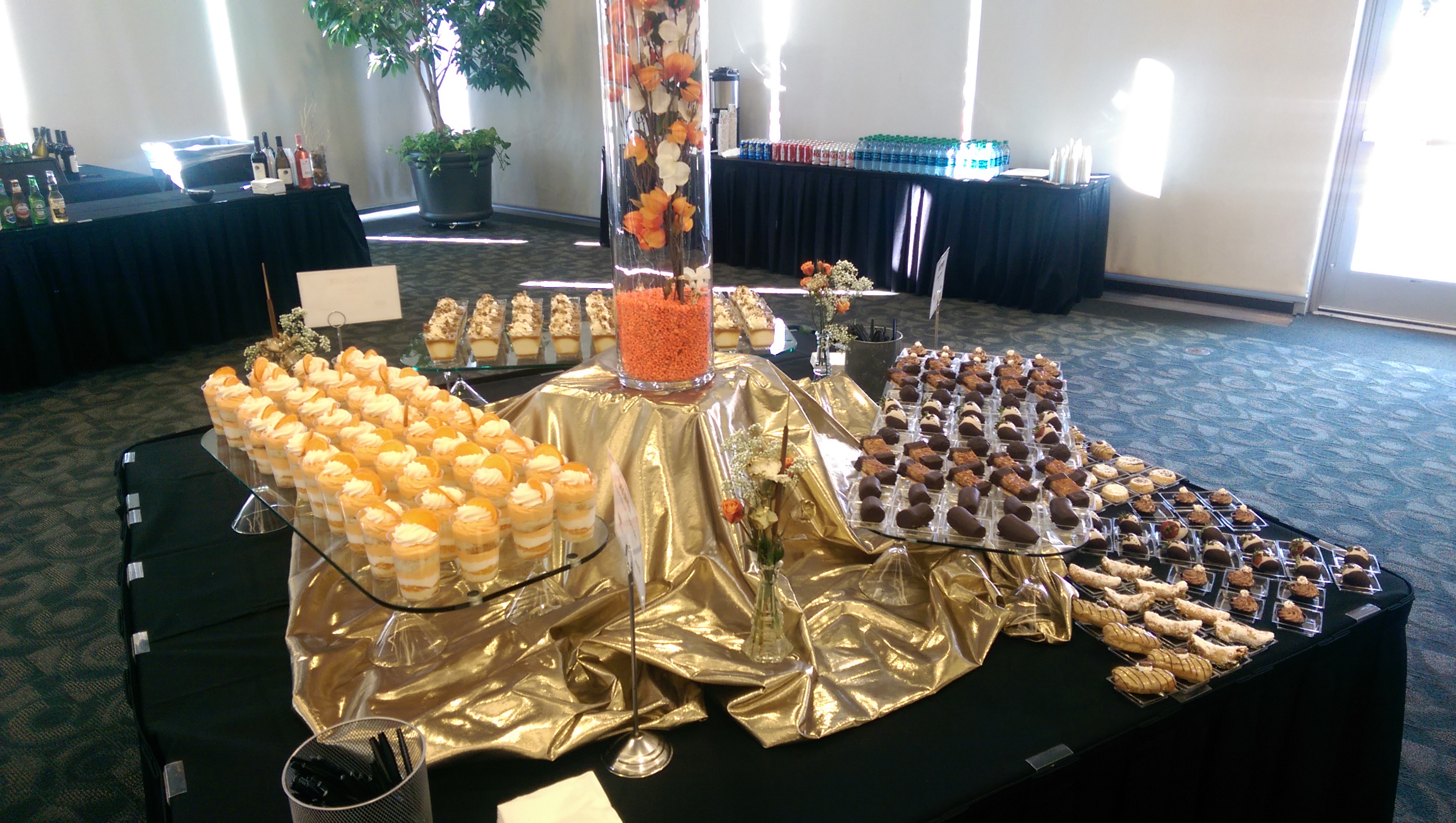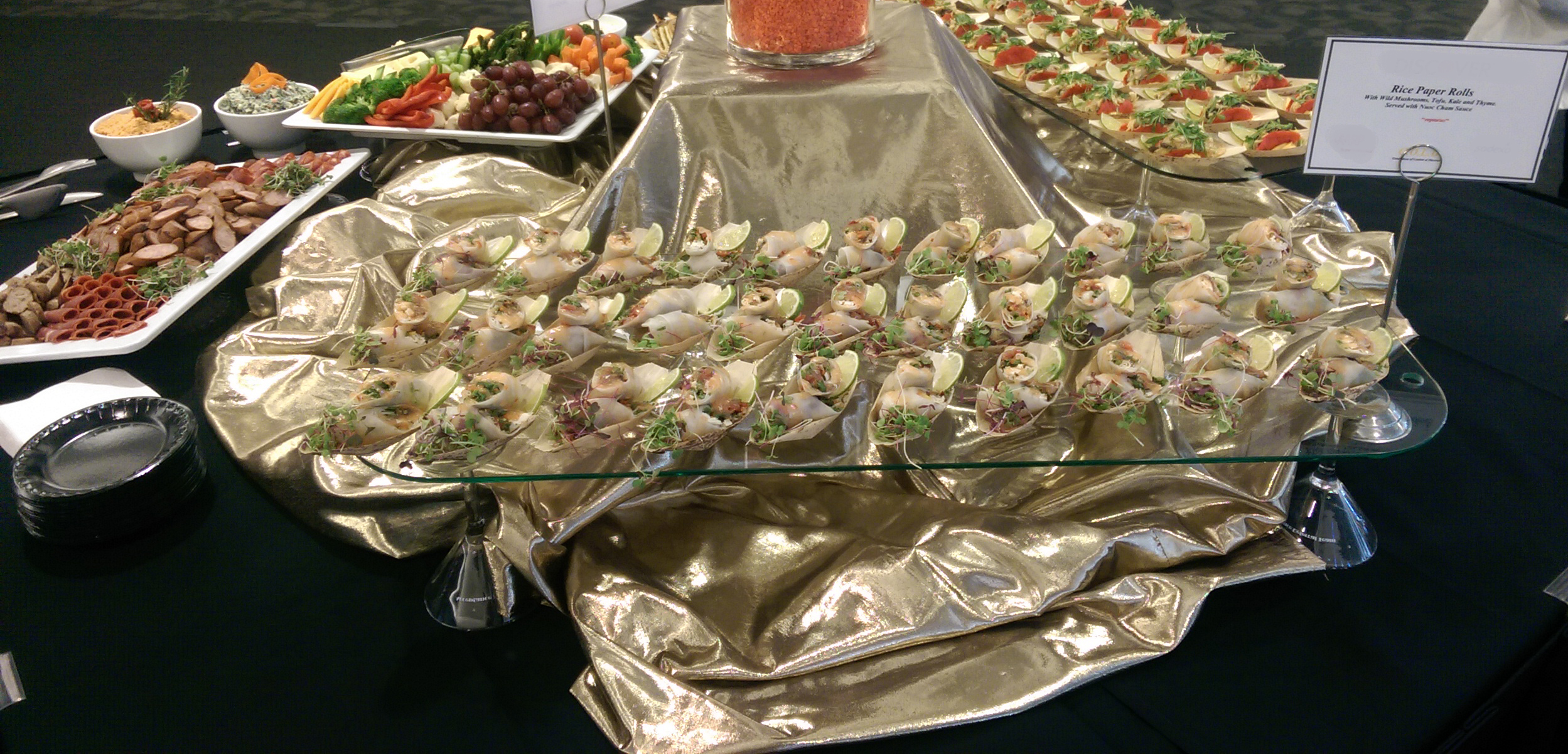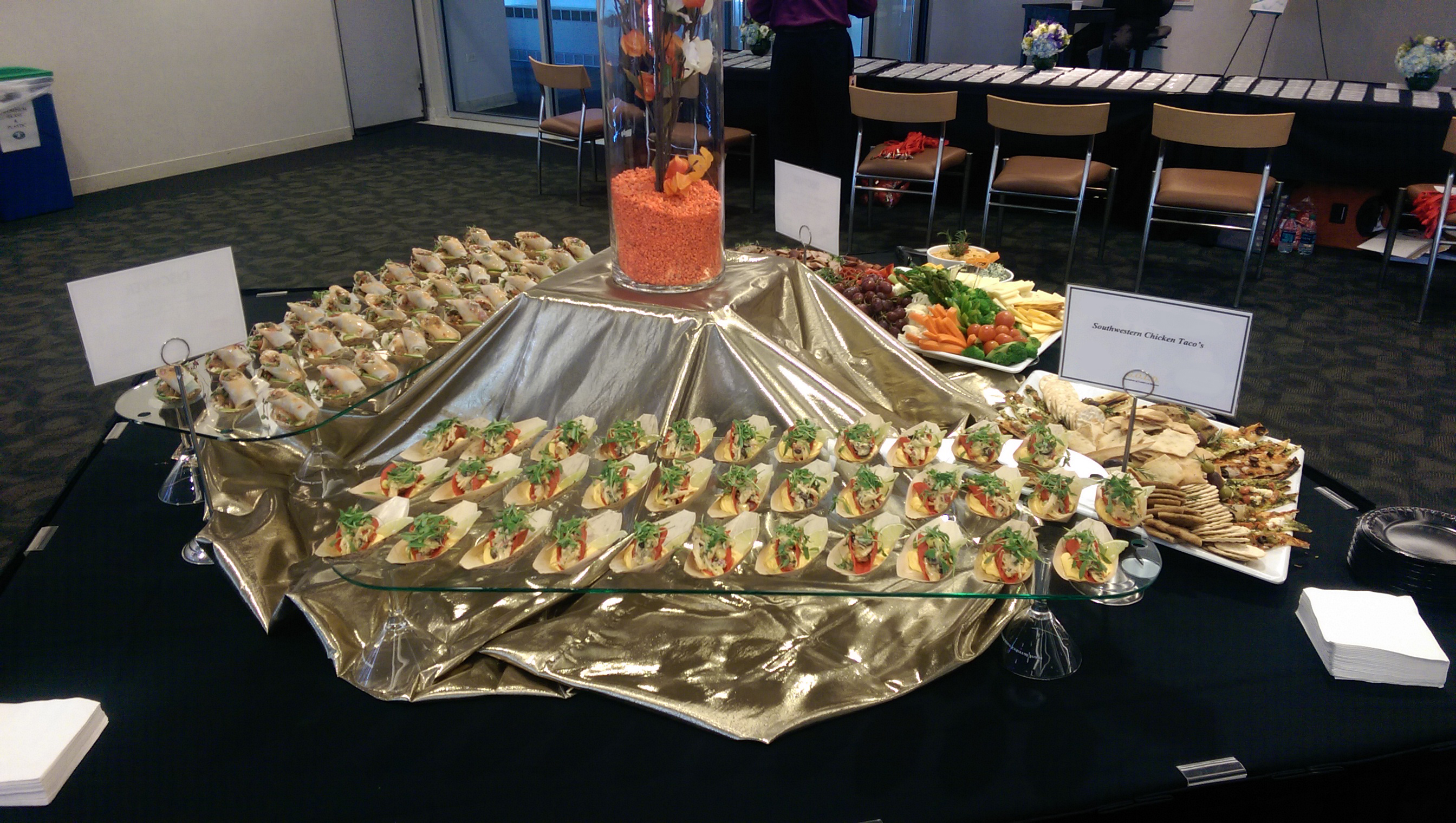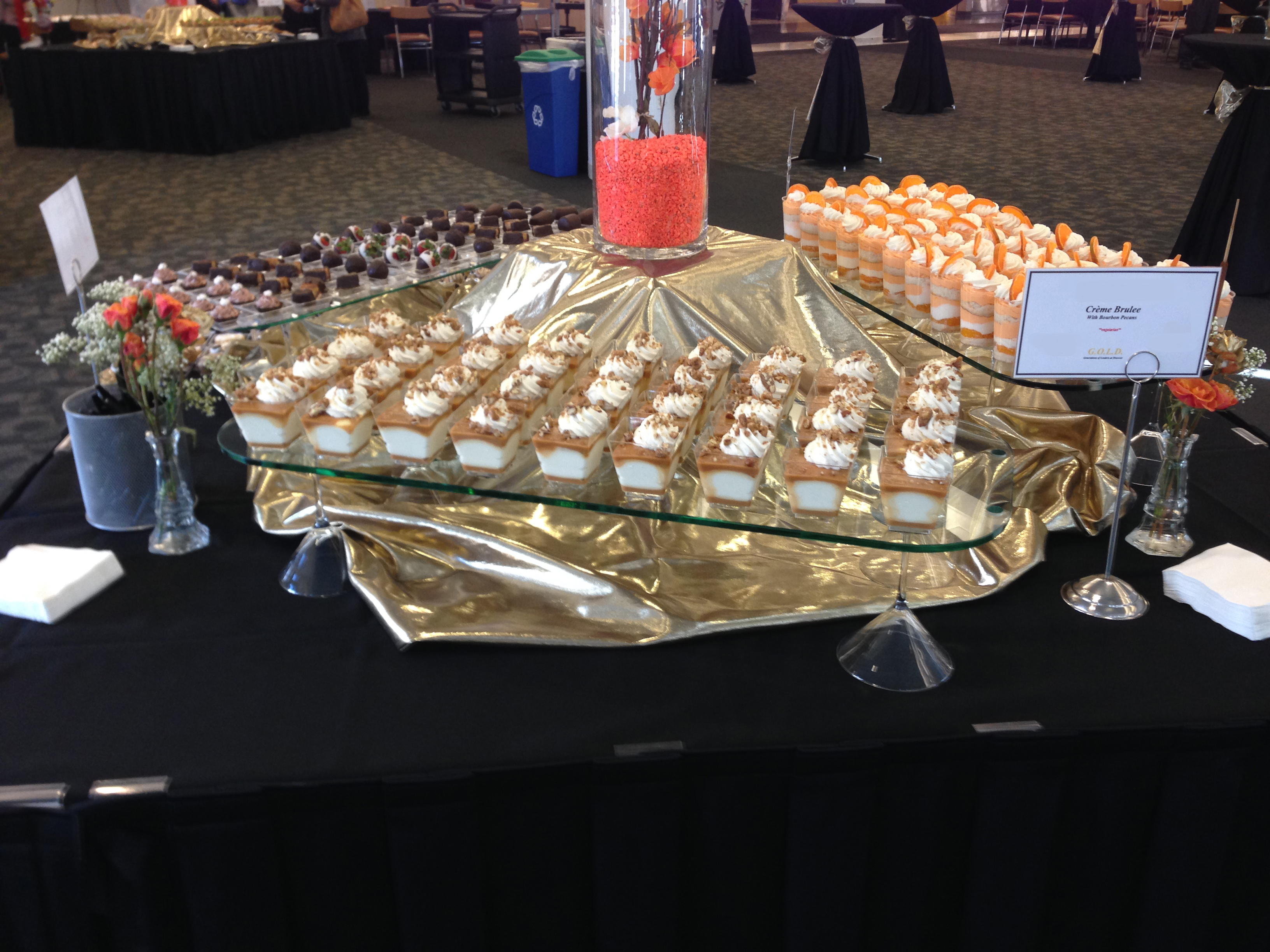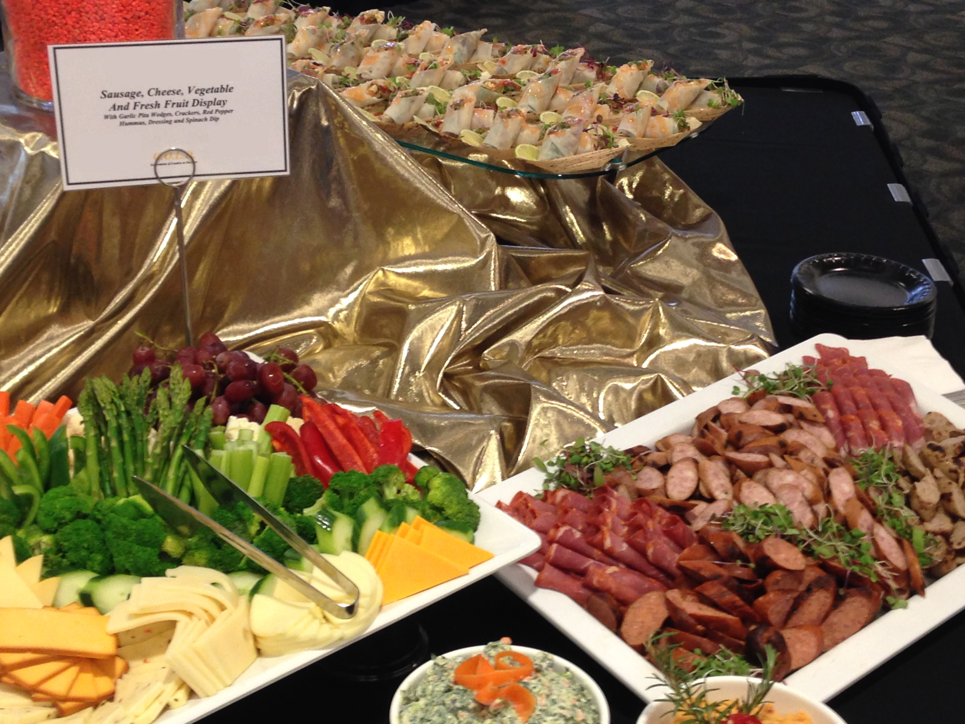 For October 2014 we assisted with a GOLD event for our client (V.I.P), hosting key business partners. Vicky handed off the food service portion of this event to a willing, capable and eager staff to pull off a reception prior to speaking engagements and networking among the meeting’s attendees. Our goal, ensure our client’s hospitality is well received and notable. We did this with elegant assorted displays of hors d’oeuvres, desserts and beverages properly themed to our client’s request. The following pictures indicate, I think we achieved these goals. Food looked awesome and tasted just the same. Well done!….. to everyone who participated.