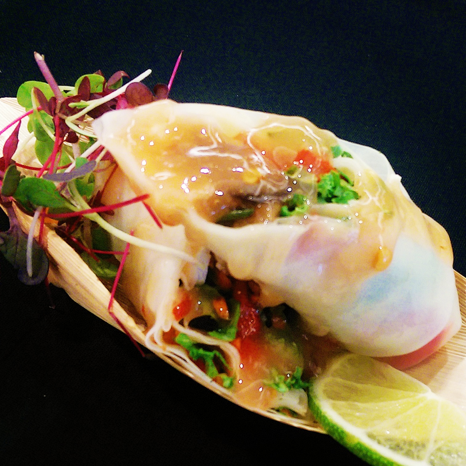 Rice Paper Roll with Wild Mushrooms, Tofu, Kale and Fresh Thyme served with Nuoc Cham Sauce